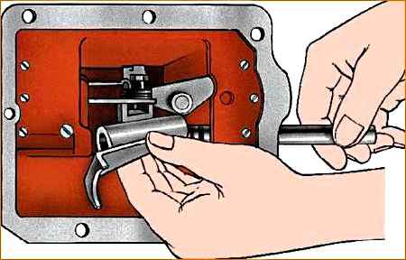 6. Установите вилку заднего хода на шток со стороны, противоположной фиксатору, и, утопив шарик фиксатора (рис. 10) в корпус крышки с помощью оправки (см. рис. 10), установите шток в нейтральное положение.
