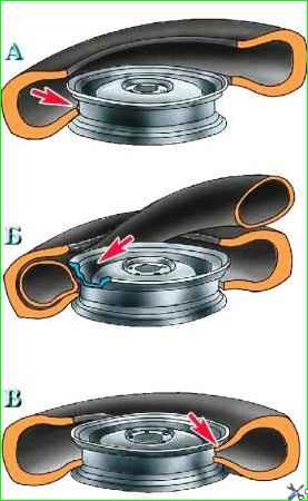 Убедившись, что нижний борт покрышки находится в углублении диска, наденьте с помощью монтажных лопаток наружный борт покрышки на диск (рис. 3, В).