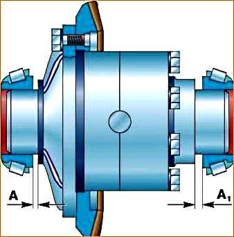 - 3. Вновь отверните болты, осторожно снимите крышку, выньте из картера дифференциал и щупом замерьте зазоры А и А1 (рис. 5 и 6) между торцами внутренних колец подшипников и коробки сателлитов.