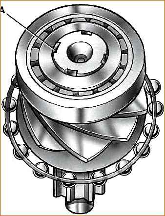- 1. Напрессуйте подшипники на ведущую шестерню. После напрессовки заднего опорного подшипника с цилиндрическими роликами раскерните торец хвостовика, на который он напрессован (рис. 7).
