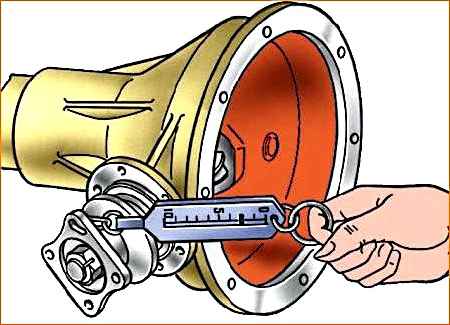 При правильной регулировке осевой зазор должен отсутствовать, а пружинный динамометр должен показывать усилие 15–30 Н (1,5–3 кгс) для приработанных подшипников и 20–35 Н (2,0–3,5 кгс) для новых подшипников при проворачивании шестерни за отверстие во фланце (рис. 9).
