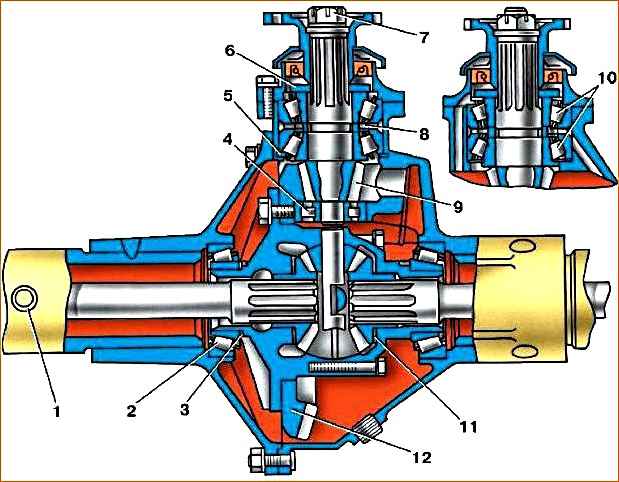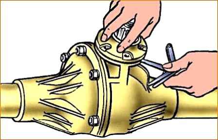 - 1. Установите в картер дифференциал с отрегулированными подшипниками в сборе.