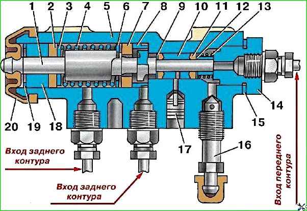 Выступание заглушки из отверстия и подтекание тормозной жидкости означают потерю герметичности уплотнительных колец 11 и, как следствие, работоспособности регулятора.