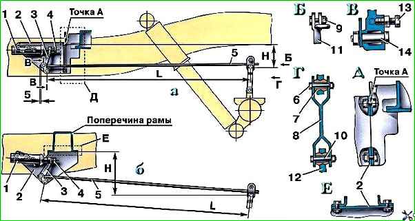 Внешним осмотром убедитесь, что регулятор и детали его привода не имеют повреждений, отсутствуют подтекания тормозной жидкости и зазоры в соединении стоики с упругим рычагом и кронштейном на заднем мосту (рис. 2).
