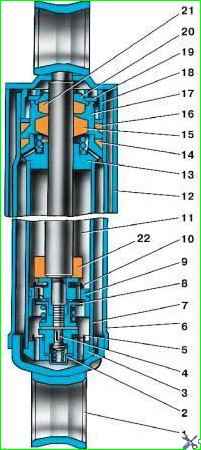 Если подтекание не прекратится, снимите амортизатор, разберите, осмотрите уплотнительные кольца и отверстие направляющей втулки 13 штока.