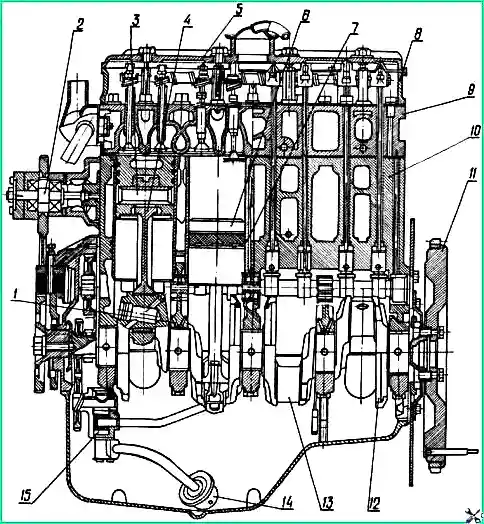 Поздовжній розріз двигуна: 1 - форсунка охолодження поршнів; 2 – водяний насос; 3 - палець поршневий; 4 – шатун; 5 – ковпак; 6 – поршень; 7 – гільза циліндрів; 8 – кришка головки циліндрів; 9 – головка циліндрів; 10 – блок циліндрів; 11 – маховик; 12 - противагу колінчастого валу; 13 - вал колінчастий; 14 - маслоприймач; 15 - масляний насос