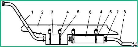 Система випуску відпрацьованих газів складається з глушника 6 (рис. 1), нейтралізатора 3, приймальної 1 і 8 вихлопної труб