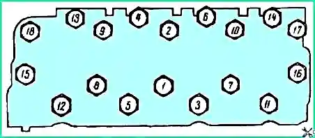 Підтяжка гайок кріплення головок циліндрів до блоку проводиться на холодному двигуні в порядку, зазначеному на малюнку 2.
