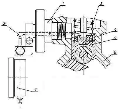 Вимірювання величини підйому штовхача: 1 - пристрій Т9590-27; 2 - важіль пристосування пружний; 3 – пружина штовхача; 4 - тарілка пружини штовхача нижня; 5 – штовхач плунжера; 6 – корпус ТНВД; 7 - індикатор І410 ГОСТ 577-68