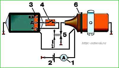 При включенні вимикача 4 амперметр 1 повинен показати струм у межах 6–7 А, а через 1–3 з струм повинен знизитися до 0.