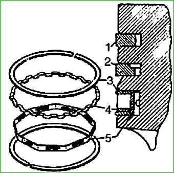 На внутрішній циліндричній поверхні нижнього компресійного кільця є виточка, завдяки якій нові кільця, встановлені в циліндр, дещо вивертаються і стикаються з циліндром тільки кромкою