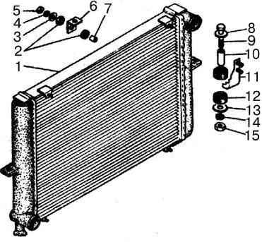 На бачках і верхній пластині остова радіатора є кронштейни для кріплення радіатора до кузова автомобіля.