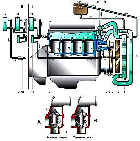 Схема системи охолодження двигунів ЗМЗ-402 та УМЗ-4215: I – з одним обігрівачем; II – з двома обігрівачами та електронасосом (для фургонів із двома рядами сидінь та автобусів); 1 – розширювальний бачок; 2 – термостат; 3 – датчик покажчика температури охолоджувальної рідини; 4 – радіатор; 5 - зливна пробка (кран) радіатора; 6 – вентилятор; 7 – ремінь приводу вентилятора; 8 – ремінь приводу насоса рідини, що охолоджує; 9 – насос охолоджувальної рідини; 10 - зливальний кран блоку циліндрів; 12 – електронасос системи опалення; 11, 13 – кран обігрівача; 14 – радіатор додаткового обігрівача; 15, 16 – радіатор основного обігрівача; 17 – основний клапан термостата; 18 – байпасний клапан.