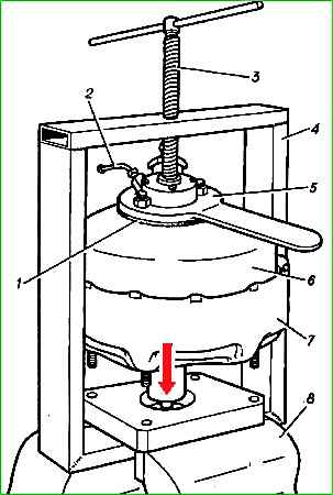- - відвернути гайку з'єднувача поршнів і зняти поршень 5 з діафрагмою 7, тарілку та завзяте кільце;