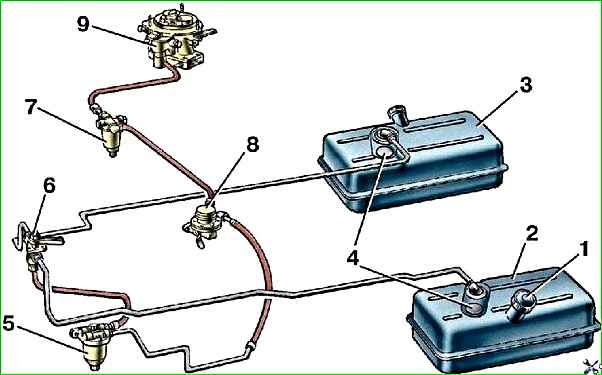 Шланги приєднані до паливного насоса, крана перемикання паливних баків, фільтра-відстійника через штуцери з накидними гайками.