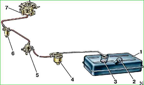 Після насоса паливо проходить через фільтруючий елемент фільтра тонкого очищення та надходить у карбюратор.
