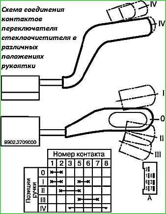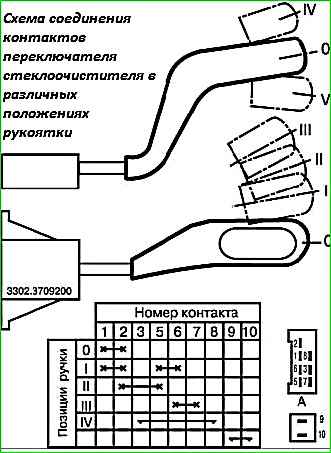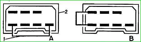Для цього необхідно відключити штекерну колодку від перемикача (вона знаходиться під панеллю приладів) і з'єднати штекерні наконечники колодки (яка залишилася на джгуті проводів, що йдуть до склоочисника), як показано на рис. 1. , "А" для малої швидкості та рис. 1, "В" для великої швидкості.