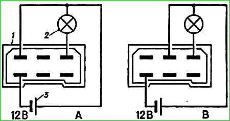 Для перевірки працездатності склоочисника, знятого з автомобіля, необхідно штекерну колодку склоочисника з'єднати за схемою, показаною на рис. 2. (лампа 2 блиматиме).