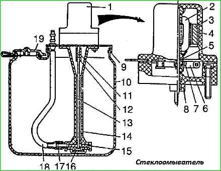 Склоомивач складається з бачка, в якому встановлений насос із приводом від електродвигуна, жиклерів та шлангів (рис. 5).