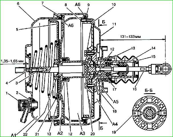 Коли педаль гальма не натиснута, порожнина А5 через зазор між діафрагмою 18 клапанів, поршнем 17 і радіальні отвори з'єднувача 22 повідомляється з порожниною А4, яка, у свою чергу, через отвори А6 в наполегливій кришці з'єднана з порожниною А2.