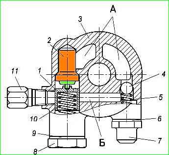 При тиску масла вище 0,7-0,9 кгс/см кульковий клапан відкривається, і масло надходить у канал корпусу термоклапана Б до плунжера 1.