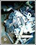 Послабити натяг ременя (на фото не показаний), для цього послабити затягування гайки 1 та регулювального болта 2 та повернути кронштейн 3 з натяжним роликом 4 до блоку циліндрів двигуна