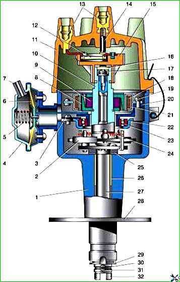 Датчик-розподільник виконує дві функції: задає момент іскроутворення та розподіляє імпульси високої напруги по циліндрах відповідно до порядку їх роботи.