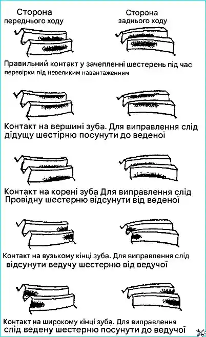 Перевірити зачеплення за допомогою фарби. Після остаточного складання та регулювання слід перевірити зачеплення шестерень.