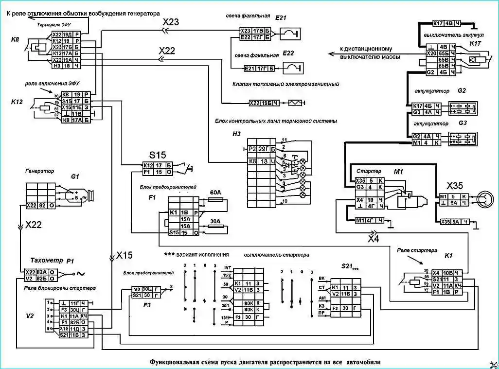 На малюнку 3 представлено функціональну схему пуску двигуна автомобілів сімейства КамАЗ.