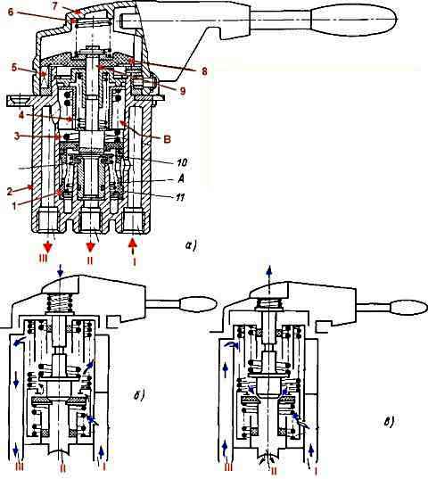 Кран керування гальмом стоянки служить для керування пружиними енергоакумуляторами приводу стоянкового і запасного гальм (рис.1, а — в)