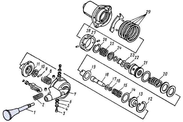 Кран управління гальмівною системою стоянки: 1 - рукоятка; 2, 8,15, 20, 25 - пружини; 3 – гвинт; 4, 6,10,17, 29 – шайби; 5 - пружинна шайба; 7 – кришка; 9 – штифт; 11 - ковпачок напрямний; 12, 26 - кільця завзяті; 13 - напрямна; 14,16, 27 - кільця; 18 – шток; 19 - тарілка пружини; 21 - поршень; 22 - кільце клапана; 23 – корпус клапана; 24 - опорна шайба; 28 - корпус