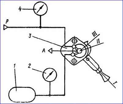 Ступінчастість зміни не повинна перевищувати 29,4 кПа (0,3 кгс/см 2). Падіння тиску на манометрі 2 до 0 має досягатися при повороті ручки на 60-70º.