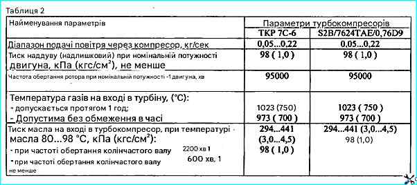 Технічні характеристики турбокомпресорів наведено в таблиці 2.