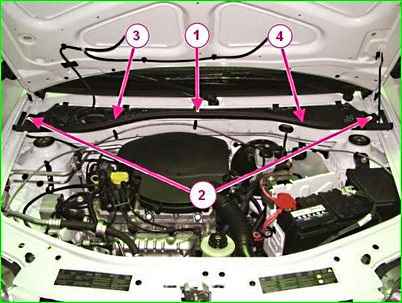 Витягнути фіксатори 2, правої 3 і лівої 4 облицювання рами вітрового вікна, зняти грати (викрутка плоска).