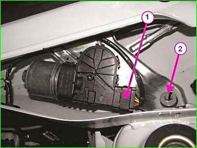 Головкою на 10 відвернути болт 2, малюнок 4, кріплення кронштейна електродвигуна механізму склоочисника, від'єднати колодку 1 від електродвигуна механізму склоочисника.
