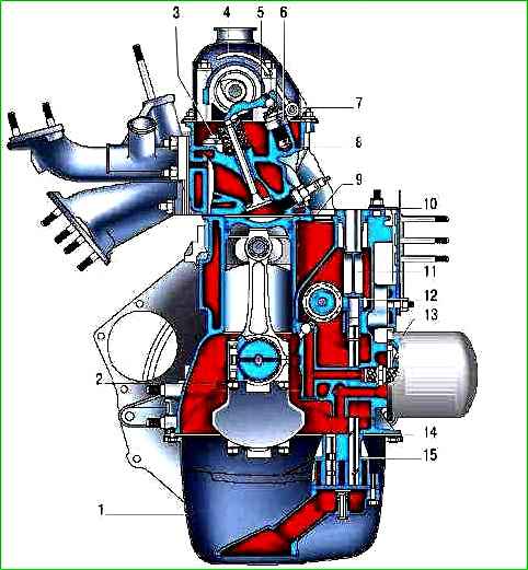 Система складається з масляного картера 1 шестерного масляного насоса 15 з вбудованим редукційним клапаном і маслоприймачем, що має сітчастий фільтр грубого очищення масла, повнопоточного фільтра 13 тонкого очищення масла з перепускним і протидренажним клапанами, датчика контрольної лампи недостатнього тиску.
