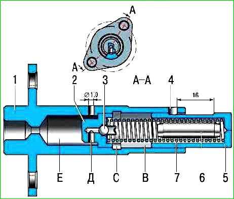 Олія із системи мастила по трубці 4 під тиском надходить у порожнину (Е) натягувача, далі через отвір (Д) і клапанний вузол 2 потрапляє в порожнину (В), де впливає на плунжер 5.
