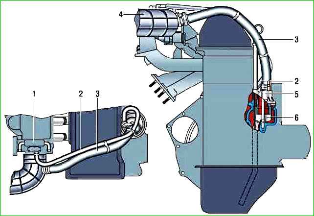 При роботі двигуна під навантаженням, коли дросельна заслінка частково або повністю відкрита, основний обсяг газів проходить по шлангу 3 другого контуру в патрубок 4, що підводить, перед дросельним вузлом і далі у впускну трубу і камери згоряння.