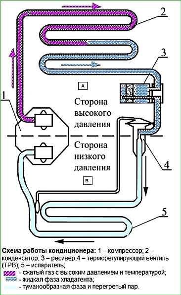Випарник 5, який знаходиться в салоні автомобіля, постійно знижує температуру повітря