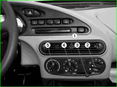 Управління системою кондиціювання здійснюється в ручному режимі, включенням кнопки (А/С) 1, рис.3, управління кондиціонером, ручки 5 регулювання температури з синьою та червоною зонами, перемикачем 2 оборотів електродвигуна вентилятора системи опалення, перемикачем 4 розподілу потоків повітря по салону (вгору, вниз, центральна частина)