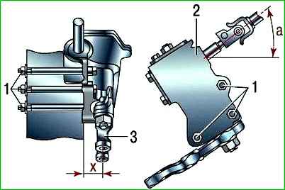 Перед тим як затягнути гайки болтів 1 (рис. 11), спеціальним пристроєм зорієнтуйте кермовий механізм так, щоб кут а = 28°.
