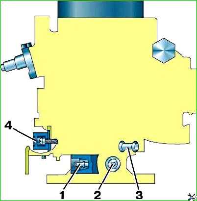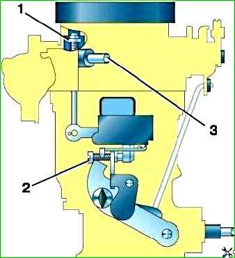 Під час експлуатації автомобіля у високотемпературних умовах зменшіть подачу прискорювального насоса, переставивши обмежувальну шайбу у верхню проточку 1 штока.