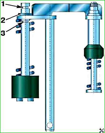 Під час експлуатації автомобіля у високотемпературних умовах зменшіть подачу прискорювального насоса, переставивши обмежувальну шайбу у верхню проточку 1 штока.