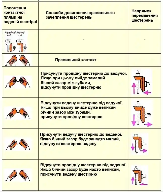 Після регулювання обов'язково перевірити правильність плями контакту.