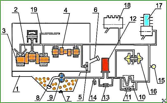 Масляний насос 9 через маслоприймач 8 забирає масло з масляного картера 1 і по каналах в блоці циліндрів і каналах корпусу масляного фільтра подає повнопоточний масляний фільтр 12, в якому воно очищається від сторонніх домішок, продуктів зносу і продуктів розкладання масла внаслідок нагрівання та окислення.