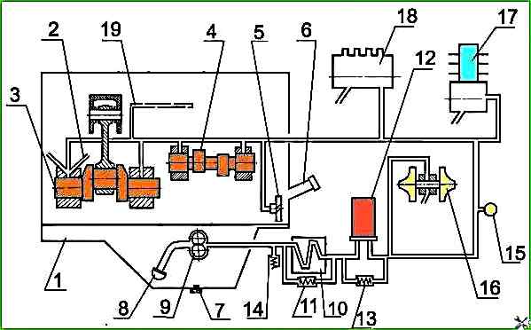 Масляний насос 9 через маслоприймач 8 забирає масло з масляного картера 1 і по каналах в блоці циліндрів і каналах корпусу масляного фільтра подає в рідинно-масляний теплообмінник 10, а потім у повнопоточний масляний фільтр 12, в якому воно очищається від сторонніх продуктів зносу та від продуктів розкладання олії внаслідок нагрівання та окислення.