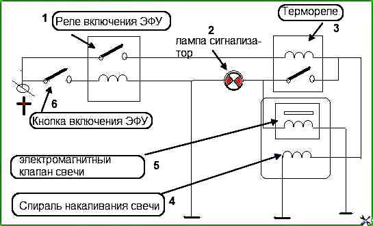 При ввімкненні кнопки ЕФУ напруга від акумуляторних батарей через реле включення ЕФУ та термореле подається на свічку факелу.