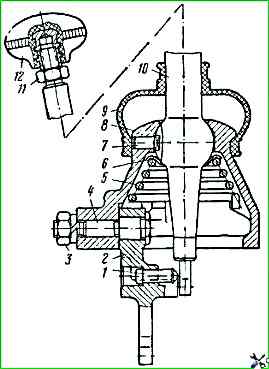 Вузол картера наконечника важеля перемикання передач: 1 - сухар проміжного важеля; 2 - проміжний важіль включення першої передачі та передачі заднього ходу; 3 - гайка осі; 4 - вісь важеля; 5 – пружина важеля; 6 – опора важеля; 7 – фіксатор важеля; 8 – картер важеля; 9 - захисний чохол; 10 - наконечник важеля перемикання передач