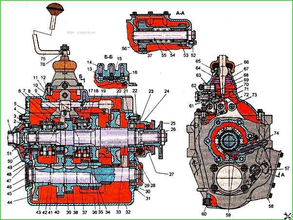 Коробка передач: 1 – первинний вал; 2, 21,30 та 45 - підшипники; 3, 28, 31 і 47 - стопорні кільця; 4 – кришка заднього підшипника первинного валу; 5 - синхронізатор четвертої та п'ятої передач; 6 – втулка шестерні четвертої передачі; 7 та 40 - зубчаста пара четвертої передачі; 8 та 38 - зубчаста пара третьої передачі; 9 - головка стрижня перемикання першої передачі та передачі заднього ходу; 10 - вилка перемикання другої та третьої передач; 11 – кришка коробки передач; 12 - установча втулка; 13 - кулька фіксатора; 14 - пружина фіксатора; 15 - штифт замкового пристрою стрижнів перемикання передач; 16 - кулька замкового пристрою, 17 - синхронізатор другої та третьої передач; 18 та 34 - зубчаста пара другої передачі; 19, - вилка перемикання першої передачі та передачі заднього ходу; 20 - зубчасте колесо першої передачі та передачі заднього ходу; 22 - черв'як приводу спідометра; 23 та 59 - шестерні приводу спідометра; 24 - кришка підшипника вторинного валу; 25 - фланець з відбивачем; 26 - гайка фланця вторинного валу; 27 та 51 - манжети; 29 - гайка проміжного валу; 32 – картер коробки передач; 33 – вторинний вал; 35, 39 та 41 - опорні шайби; 36 і 42 - замкові кільця; 37 - зубчасте колесо передачі заднього ходу проміжного валу; 43 - проміжний вал; 44 – шестерня постійного зачеплення; 46 - заглушка; 48 – прокладка; 49 - блокуючий палець, 50 та 53 - роликові підшипники; 52 - стопорна пластина; 54 та 67 - пружини; 55 - вісь блока зубчастих коліс передачі заднього ходу; 56 - блок зубчастих коліс передачі заднього ходу; 57 - пробка контрольно-заливного отвору; 58 - кришка люка відбору потужності; 60 - зливна пробка з магнітом; 61 - сапун; 62 - запобіжник вимикання першої передачі та передачі заднього ходу; 63 - вісь проміжного важеля; 64 - картер наконечника важеля перемикання передач; 65 – фіксатор важеля; 66 - чохол важеля перемикання передач; 68 - наконечник важеля перемикання передач; 69 - проміжний важіль; 70 - сухар проміжного важеля; 71 - стрижень перемикання першої передачі та передачі заднього ходу; 72 - шток перемикання четвертої та п'ятої передач; 73 - шток перемикання другої та третьої передач; 74 - штуцер валу приводу спідометра; 75 - важіль перемикання передач