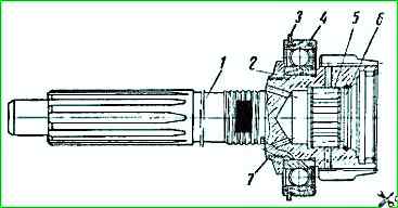 Встановити на шліці валу синхронізатор 8 другої та третьої передач, встановити на шийку вала шестерню 7 третьої передачі, поставивши завзяту шайбу 6, встановити втулку 5 шестерні четвертої передачі, направивши її фіксаторний штифт у шліцевий паз валу.